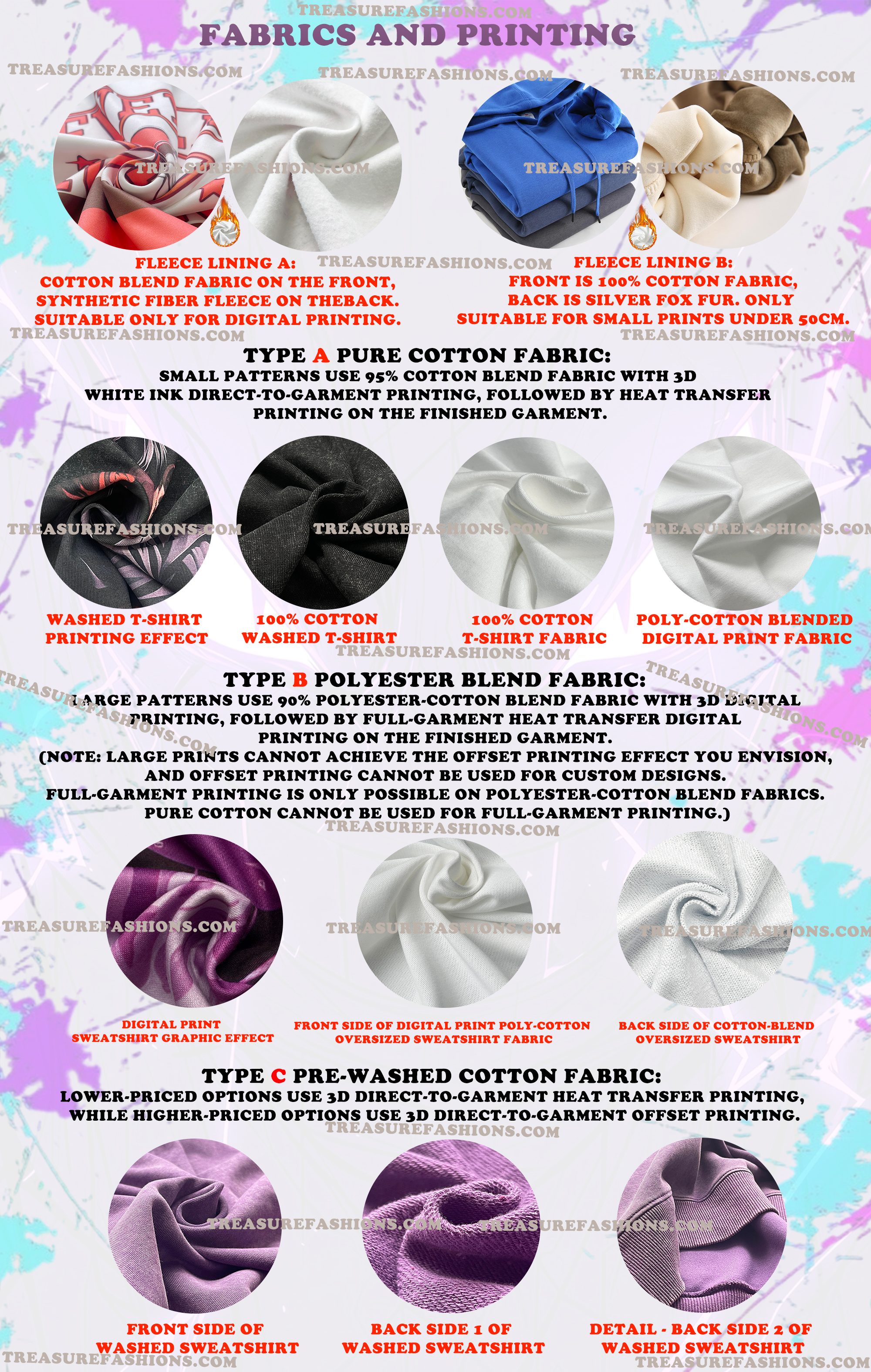 Fabrics and Printing Type A Pure Cotton Fabric: Small patterns use 95% cotton blend fabric with 3D white ink direct-to-garment printing, followed by heat transfer printing on the finished garment. Type B Polyester Blend Fabric: Large patterns use 90% polyester-cotton blend fabric with 3D digital printing, followed by full-garment heat transfer digital printing on the finished garment. (Note: Large prints cannot achieve the offset printing effect you envision, and offset printing cannot be used for custom designs. Full-garment printing is only possible on polyester-cotton blend fabrics. Pure cotton cannot be used for full-garment printing.) C. Pre-washed cotton fabric: Lower-priced options use 3D direct-to-garment heat transfer printing, while higher-priced options use 3D direct-to-garment offset printing.